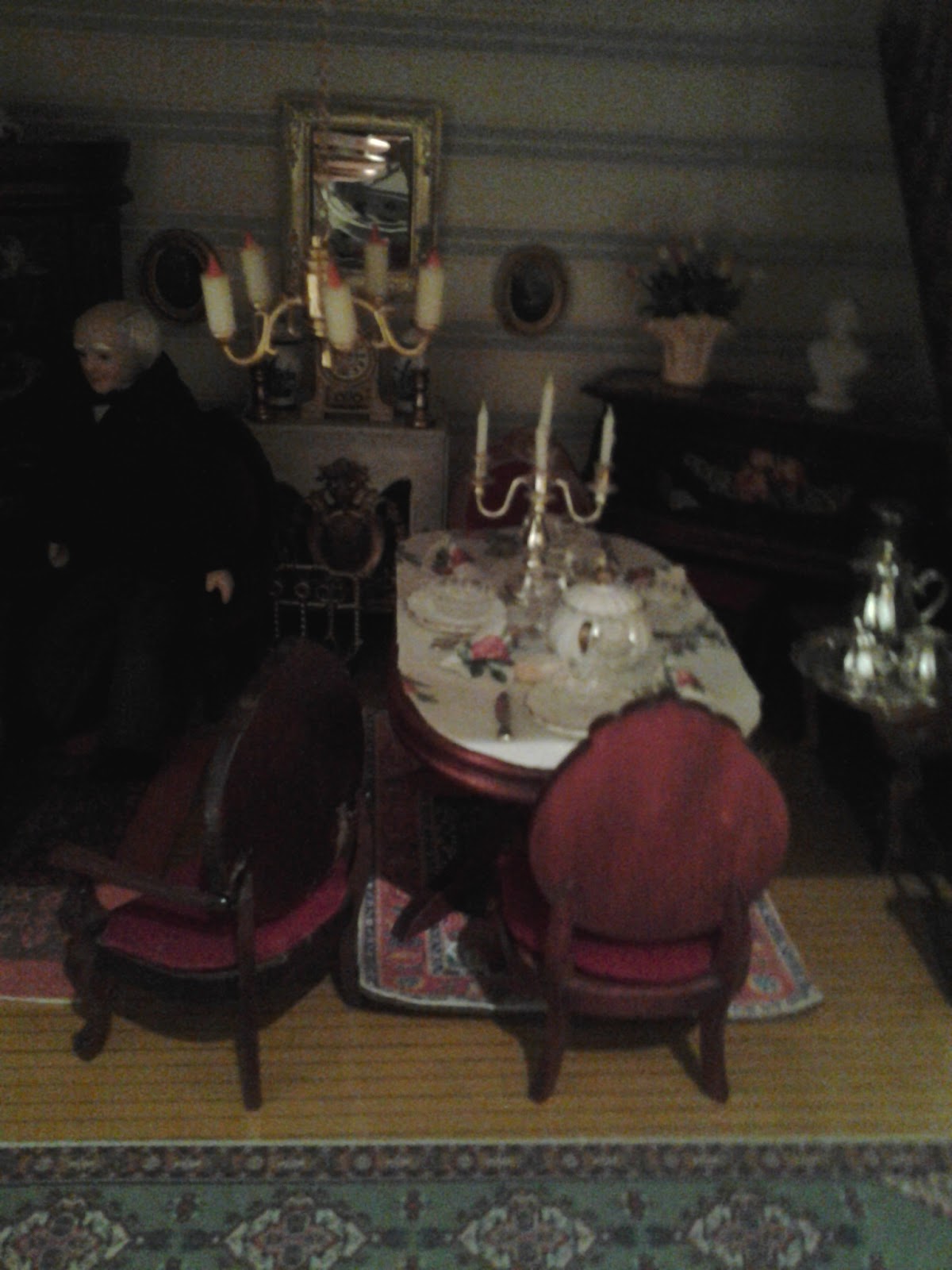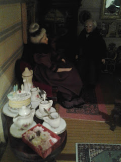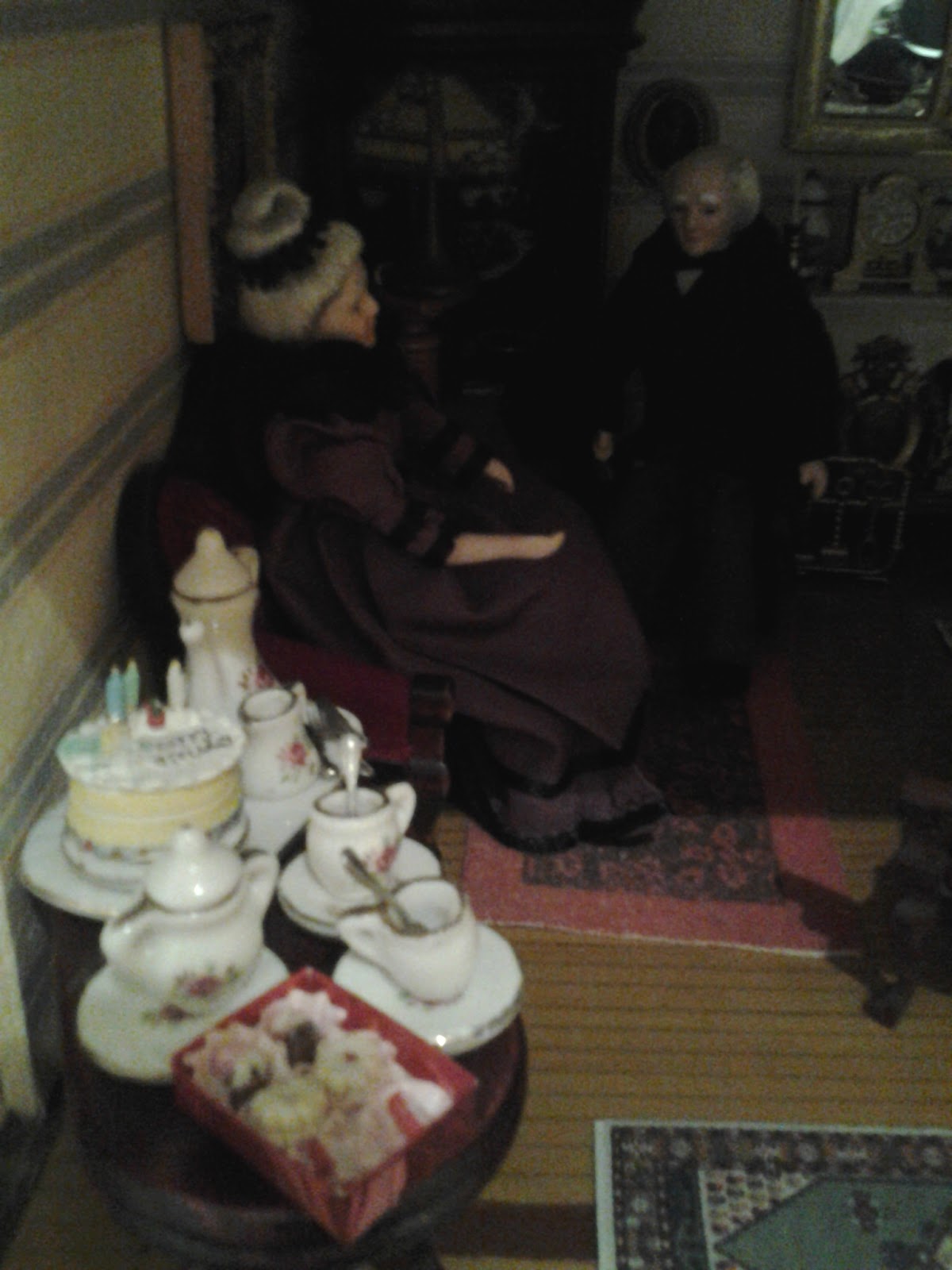 Ed infine il salone dove si festeggia il compleanno della padrona di casa, tavola imbandita, rose sopra il pianoforte e i pasticcini ela torta con le candeline!