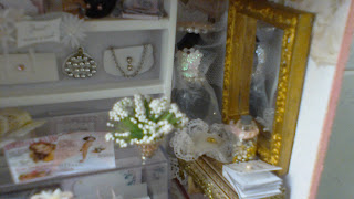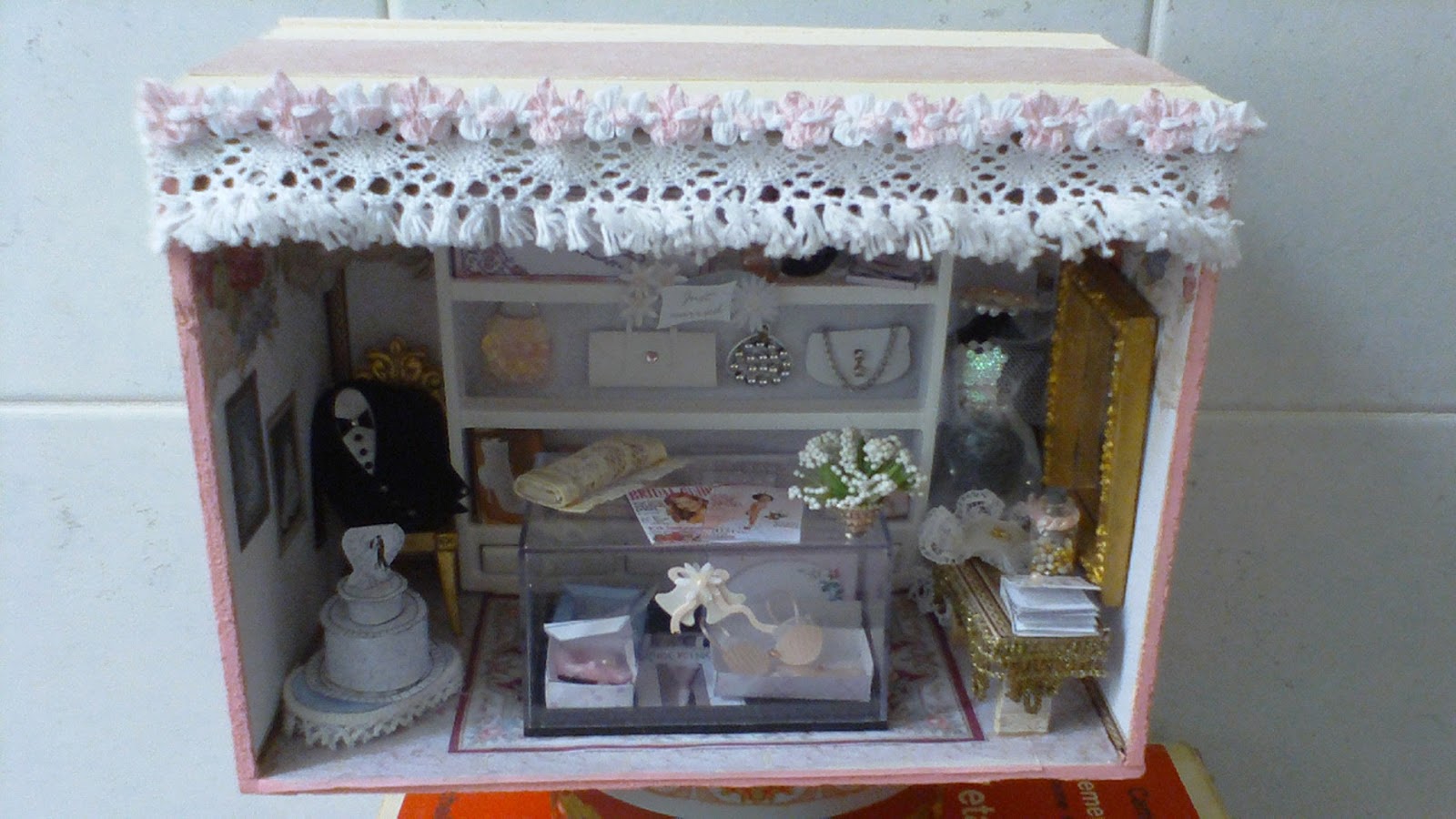 Questo è il negozio della sposa, uno dei primi roombox che ho realizzato per la figlia di una mia amica che si sposava. Come potete notare ho realizzato un negozio un po' virtuale...in quanto una sposa può trovare al suo interno tutti ciò che gli occorre; dal vestito alla biancheria intima, agli accessori, all'album e alle partecipazione fino alla torta e ai confetti. Ah dimenticavo... il cuscino ricamato con le fedi!!