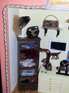 Stasera sono a cena fuori per cui ho poco tempo da dedicare al mio blog a cui ci tengo tanto perché inserisco solo foto o immagini che riguardano il mio hobby preferito. Ho pensato perciò di inserire la foto del negozio di bijoux che ho riprodotto in miniatura sotto desiderio della stessa proprietaria. Ho cercato di riprodurlo più fedelmente possibile, costruendo dai mobili a tutto ciò che concerne orecchini, collane e accessori vari come cappelli, cerchietti e borsette.
