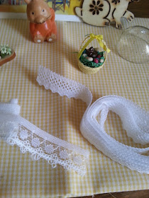 come la stoffa a quadrettini bianca e gialla ( ne farò una tovaglia), il cestino con le ovette e il pulcino di cioccolata