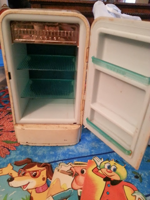 anch'io ho un frigo simile però celeste. Che ricordi! Ho ancora quasi tutti i miei giocattoli peccato che mia mamma con le manie di fare spazio ogni tanto ne ha fatto sparire qualcuno perchè ormai ero grande. Di contro anch'io oltre le miniature compro vecchi giocattoli, mi appassionano, e immagino il loro passato in mani di altre bimbe.