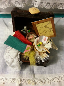 Il terzo baule l'ho dedicato a colei che ama cucire e...perciò non può che esserci nel suo interno: pizzo antico, stoffe, velluto, il tulle ed il tamburello per ricamare, il cesto con filo, ago, metro, forbici e ritagli di stoffa nonché il cartamodello di un abito di moda. Una guida alla realizzazione di punti speciali ed infine bottoni e l'inseparabile ditale per non pungersi.