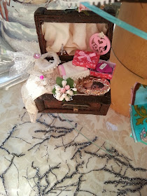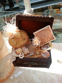 The third trunk I have dedicated to the woman who likes to sew ... and therefore can not be there in its interior: antique lace, fabrics, velvet, tulle and embroidery tambourine, the basket with thread, needle, tape measure, scissors and scraps of cloth as well as the pattern of a fashionable dress. A guide to the implementation of special points and finally buttons and the inseparable thimble for not getting stung.